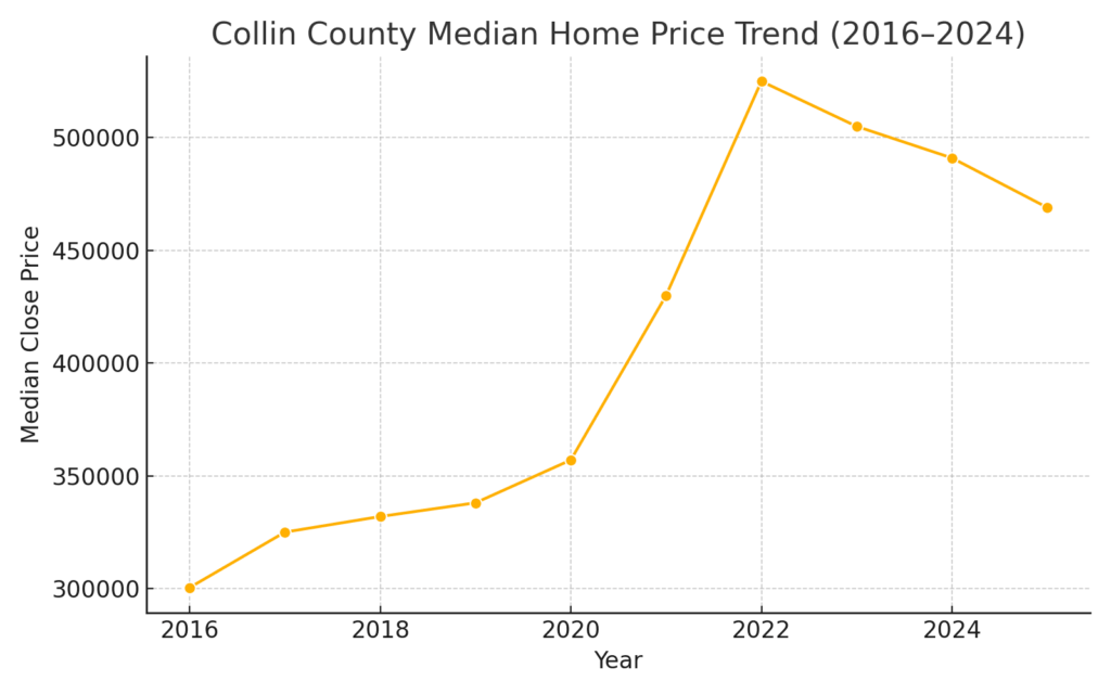 - Collin County: The median home price rose from $300,393 in 2016 to $525,000 in 2022 before a slight dip to $499,000 in 2024. That’s still a 66% increase over 8 years.
