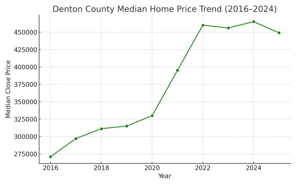 - Denton County: Prices jumped from $271,000 in 2016 to $475,000 in 2022, softening to $450,000 in 2024. That’s a 66% increase as well.